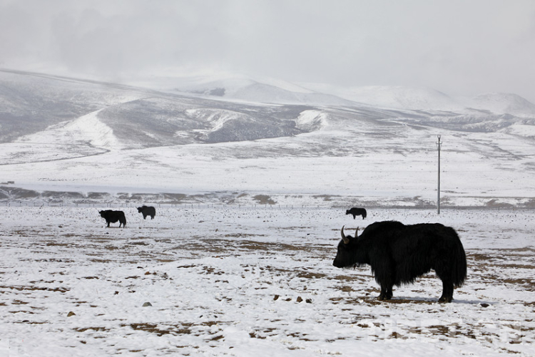 時(shí)已暮春,但在高寒牧區(qū)天然草場(chǎng),草還沒發(fā)芽,洛絨赤乃只好讓牛在雪地里啃冬天留下的枯草。雖然定居點(diǎn)牛棚里有儲(chǔ)存的人工飼草,但還是要備不時(shí)之需,因?yàn)榇合闹贿€會(huì)經(jīng)常下雪,也是牦牛最難熬的時(shí)節(jié)。