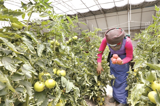 圖為在墨竹工卡縣現(xiàn)代農(nóng)業(yè)示范園溫室大棚里搬遷戶達(dá)瓦卓瑪正在摘西紅柿,到處都是一派豐收的景象。 拉薩融媒記者 貢嘎來松 攝