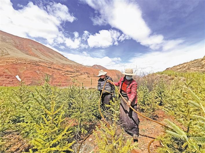 西藏昌都市丁青縣覺恩鄉(xiāng)絨通村苗木種植項目總投資2000萬元,采取“公司+基地+農(nóng)戶”的運作模式。2018年底,基地開工建設(shè),93戶農(nóng)戶以每畝每年1000元的價格參與500畝的土地流轉(zhuǎn),項目實施階段共計880人次的貧困戶參與了務(wù)工。至2019年6月,已成功栽下云杉、昌都楊、柳樹、榆樹4個品種,共計97萬株樹苗。目前,在基地長期務(wù)工的村民有8名,年收入近2萬元。