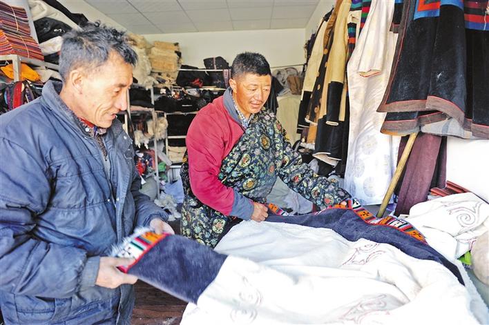 走進(jìn)位于縣城的普保鎮(zhèn)色林錯(cuò)農(nóng)畜產(chǎn)品銷售基地,嘎瑪平措正在和徒弟次仁桑波制作藏裝。不大的房間里,掛滿藏裝、藏帽和羊皮襖等手工制品。