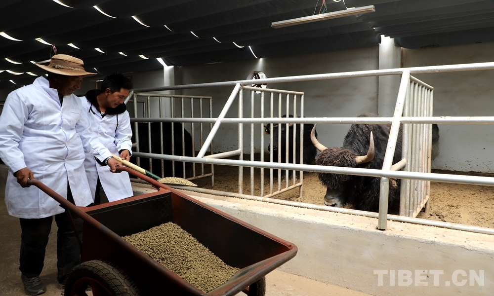 中國西藏網(wǎng)訊 一鏟鏟飼料倒到食槽內(nèi),牦牛悠閑地慢慢咀嚼。中午時分,西藏自治區(qū)昌都市類烏齊縣濱達(dá)鄉(xiāng)央宗村的向巴郎加和幾位村民正在當(dāng)?shù)氐年笈6唐谟适痉痘貎?nèi)飼喂近期將要出欄的牦牛。