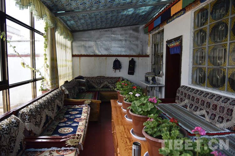 采訪(fǎng)中,印象最深的是索南益西家的那些花。一株三角梅放在陽(yáng)光房的窗臺(tái)上,陽(yáng)光照耀下,明媚亮眼。海棠花最多,扦插不久的海棠花并不高,陽(yáng)光房的桌子上有六七盆,開(kāi)著或紅或粉或白的花。還有一盆吊蘭,藤蔓隨著繩子攀爬,向屋頂延伸。