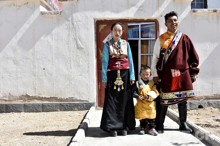 圖為西藏自治區(qū)阿里地區(qū)改則縣圓夢(mèng)新居易地扶貧搬遷點(diǎn)居民扎西頓珠和妻子以及小兒子在家門(mén)前合影 攝影:王媛媛