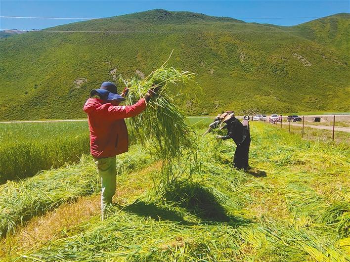 圖為索縣榮布鎮(zhèn)農(nóng)牧民群眾正在人工種草基地收割燕麥草。記者 萬靖 攝