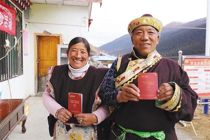 米林縣里龍鄉(xiāng)朗貢村農(nóng)牧民獲“鉆石卡”貸款證,喜笑顏開。 (圖文均由農(nóng)行林芝分行提供)