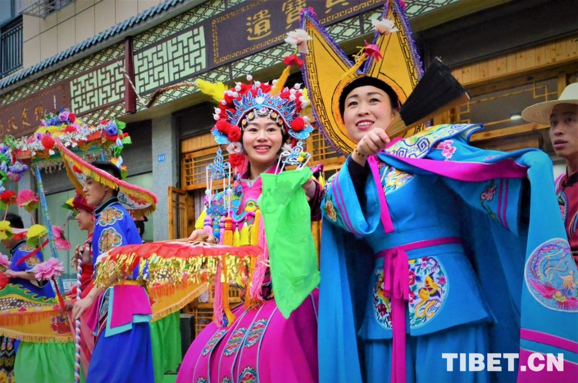 圖為譚琴琴(右二)在遺寶寶風(fēng)情館前展示利川燈歌 攝影:歐帆