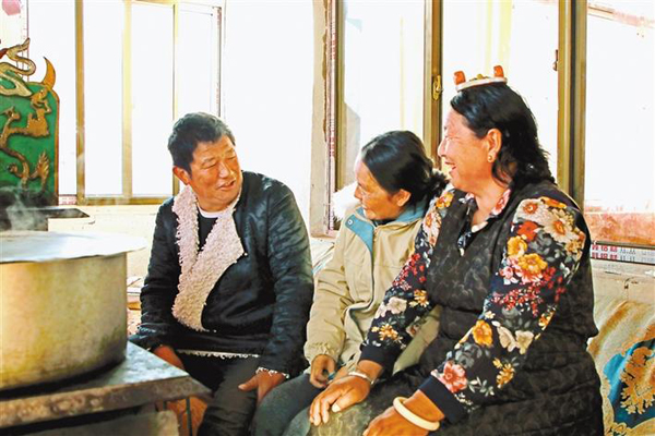 洛松新巴夫妻和兒媳(中)坐在新家里聊家常。