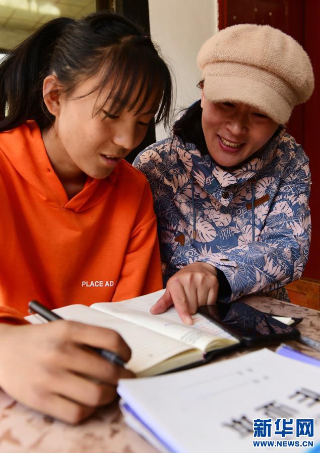 2020年3月26日,在西藏林芝市朗縣扎西塘村的一戶建檔立卡貧困戶家中,西藏林芝市委宣傳部駐村工作隊(duì)員何曉雪(右)正在為學(xué)生輔導(dǎo)功課。 新華社發(fā)(索朗羅布 攝)