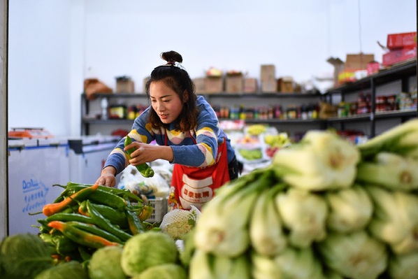 在西藏昌都市丁青縣尺牘鎮(zhèn)農(nóng)貿(mào)市場,商販在整理蔬菜。記者 詹彥 攝