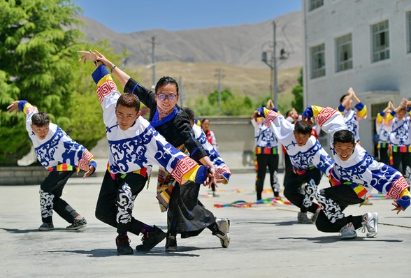 在西藏山南市第一高級(jí)中學(xué),來自湖北省武漢市旅游學(xué)校的援藏教師馬丹(左三)指導(dǎo)學(xué)生練習(xí)校園啦啦操。記者 張汝鋒 攝