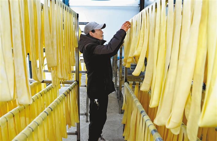 圖為那曲市噶爾德生態(tài)畜牧業(yè)發(fā)展有限公司員工正在晾曬奶制品“拉拉”。記者 唐斌 洛桑 攝