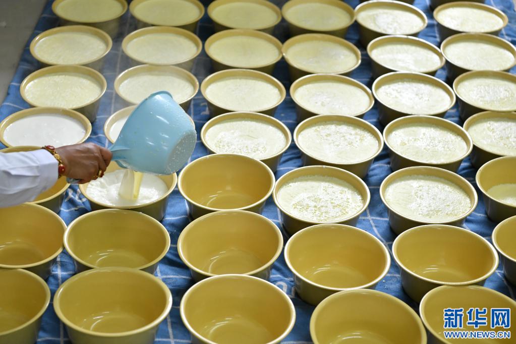 西藏娘亞牦牛養(yǎng)殖產業(yè)發(fā)展有限責任公司的員工在制作傳統(tǒng)手工酸奶(7月28日攝)。新華社記者 李鑫 攝
