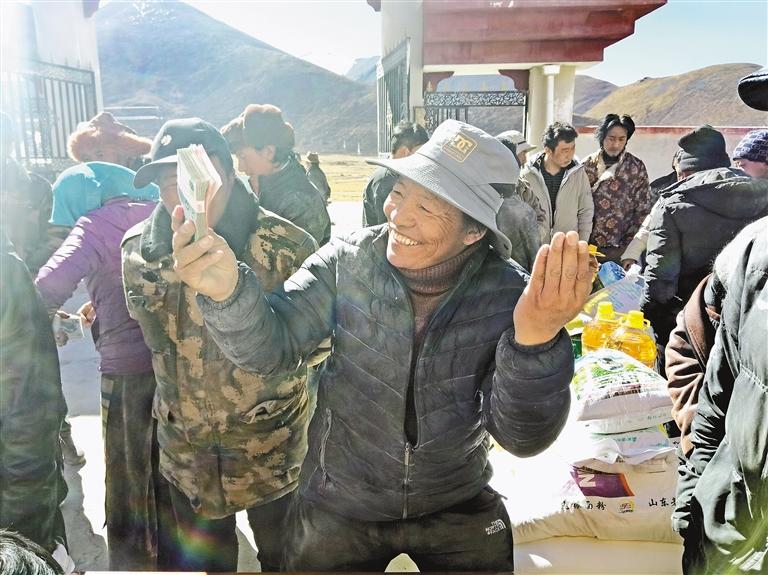 圖為嘉黎縣夏瑪鄉(xiāng)坡爾倉(cāng)村村民洛桑拿到分紅后,喜笑顏開。 記者 萬靖 攝