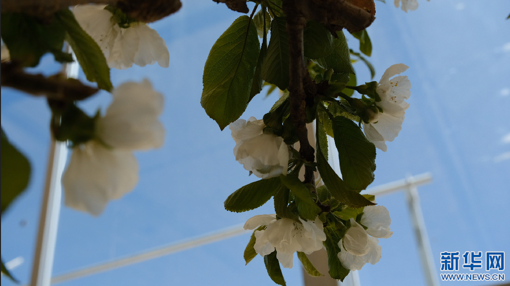 圖為吞彌現(xiàn)代農(nóng)業(yè)產(chǎn)業(yè)園區(qū)大棚里盛開的車厘子花。新華網(wǎng)發(fā) 貢桑央吉(實習生)攝