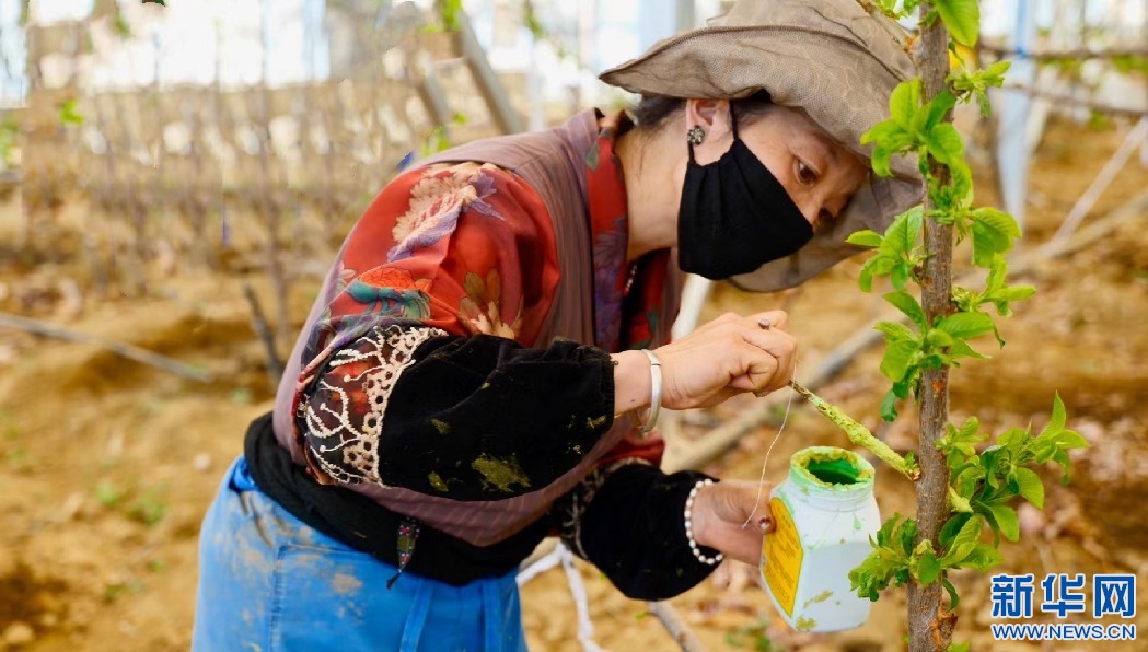 工作人員在檢查車厘子花有無病害。新華網(wǎng) 雪珍 攝