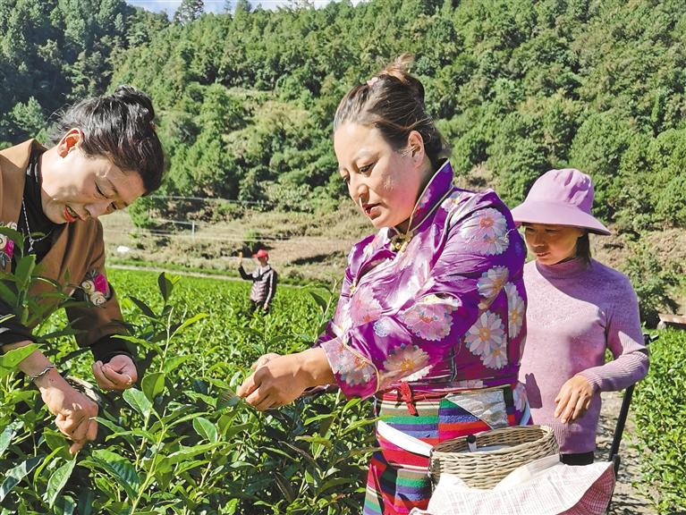 察隅縣下察隅鎮(zhèn)沙瑪村村民正在采茶。謝筱純 王珊 張猛 通訊員 滕云 攝