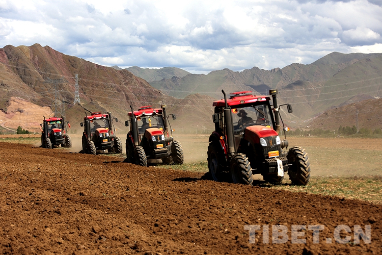 圖為在曲嘎強(qiáng)村四臺農(nóng)用機(jī)械聯(lián)合作業(yè)耕種飼草 攝影:王佳豪