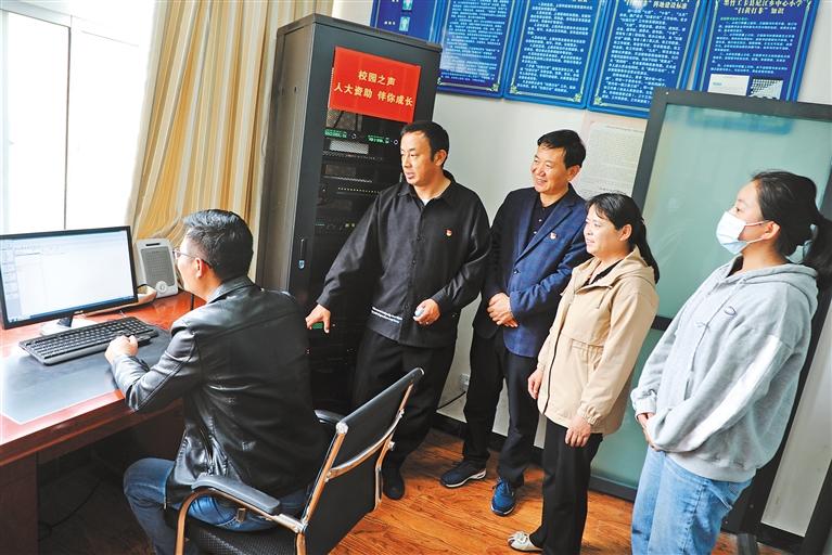 圖為墨竹工卡縣人大常委會(huì)黨組書記、主任張志文(左三)和人大代表一起回訪,了解尼瑪江熱鄉(xiāng)中心小學(xué)更換的廣播系統(tǒng)使用情況。記者 格桑倫珠 裴聰 攝