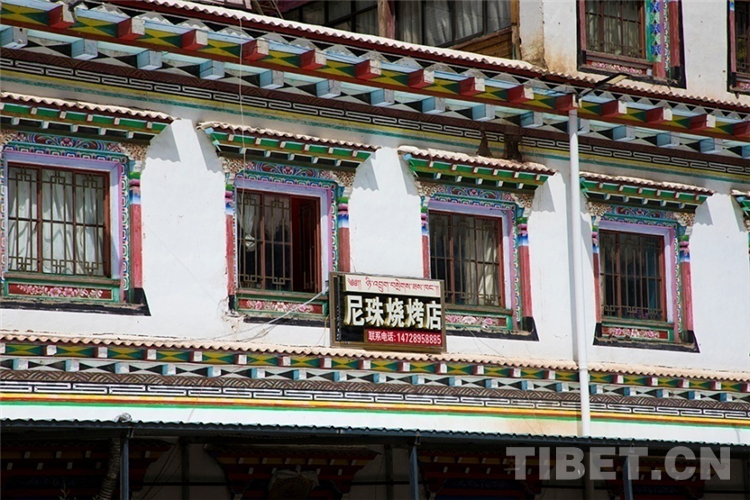 依山而建的藏式三層小樓里,丁增拉姆將房屋裝修得華麗亮堂,墻壁上繪有吉祥圖案,天花板與地板相接的立柱滿是精致的雕刻和彩繪,掛著吉祥的哈達(dá)。門外小院臺階旁的葡萄藤密密地纏繞在架子上,成串果實掛在枝頭。單獨分離出來的廚房和餐廳,也是孩子們的游樂場,沐浴著陽光下棋、讀書,一片歡聲笑語??拷鼧求w的小小花壇自然隔開了生活區(qū)和商業(yè)區(qū),一樓就是丁增拉姆家的尼珠燒烤店。沿著馬路的空地,搭建了長長的涼棚,夜晚在這里和三五好友吃著燒烤,吹著清涼的風(fēng),望著閃耀的星星,談?wù)勅松屠硐?,再舒服不過了。