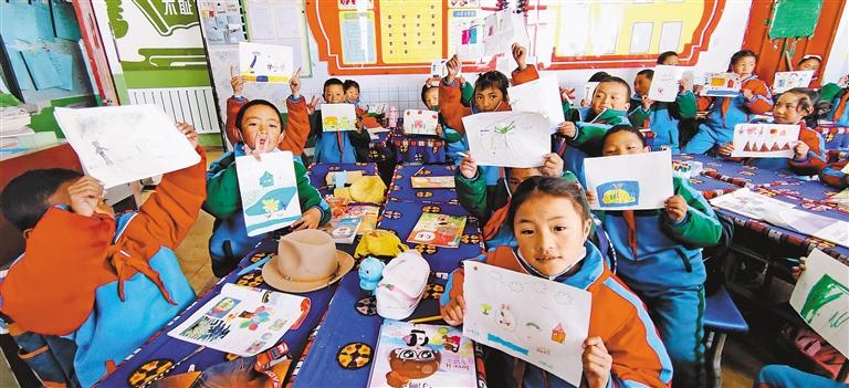 圖為那曲市小朋友展示他們參加“鄉(xiāng)村振興 那曲奮進”活動的作品。那曲采訪組 攝