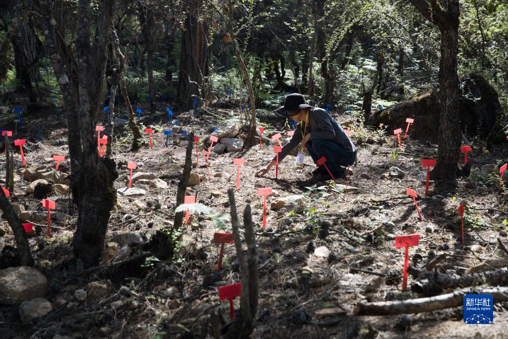 在波密縣扎木鎮(zhèn)東若村林地,工作人員在查看林下?lián)嵊牟靥炻槌砷L(zhǎng)情況。新華社記者 金立旺 攝