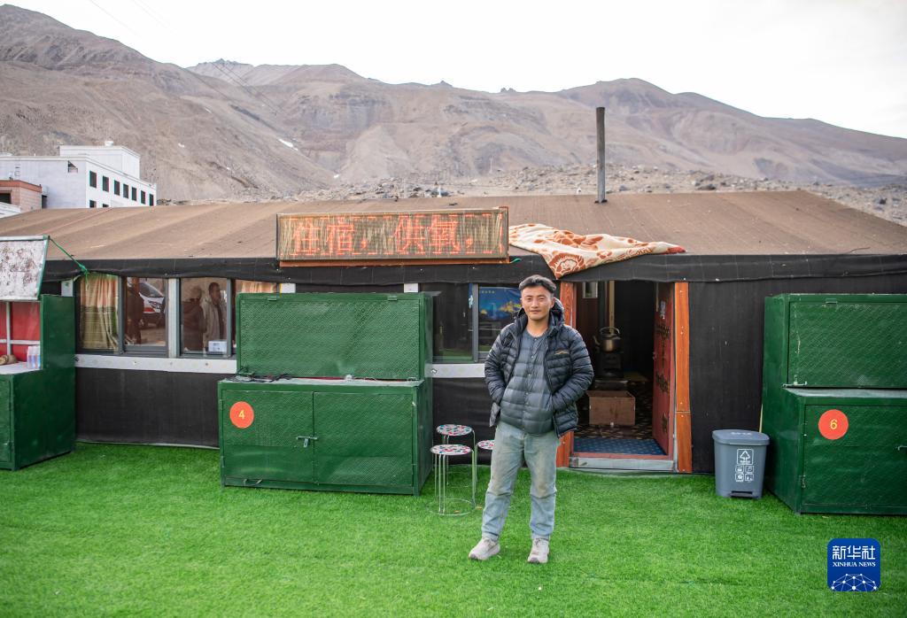 旦增在自家的帳篷旅館前(5月13日攝)。新華社記者 孫非 攝