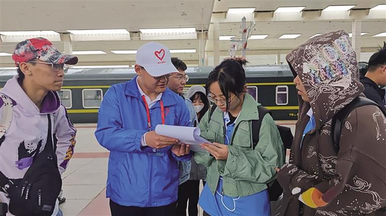 “到西部去、到基層去、到祖國和人民最需要的地方去?!?月24日,2023屆大學(xué)生西部計劃西藏專項志愿者陸續(xù)抵藏報到?,F(xiàn)場,共青團(tuán)西藏自治區(qū)委員會組織了前幾屆志愿者在火車站接站?!拔沂菑暮幽线^來做志愿者的,在西藏已經(jīng)2年了,一直在自治區(qū)經(jīng)信廳上班。今天是過來接學(xué)弟學(xué)妹們的,幫助他們登記報到?!表n義凡說。中午11點左右,火車進(jìn)站,志愿者們陸續(xù)前來報到?!斑@是我第一次來西藏,還是以志愿者的身份,我會好好工作,為西藏的發(fā)展作出自己的貢獻(xiàn)?!眮碜蕴旖虻奶锟苏f。