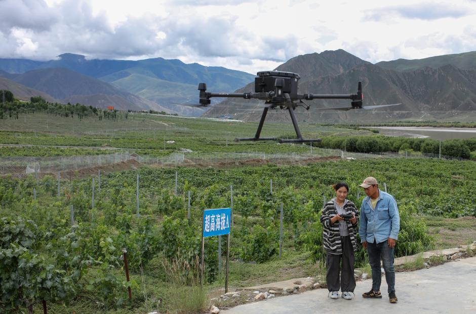7月26日,桑日縣一家葡萄酒企業(yè)的員工曲珍(左)在葡萄園里向技術員何志榮學習使用農用無人機。[詳細]