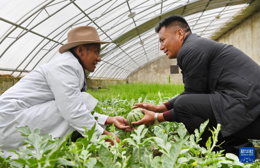 措勤縣農(nóng)牧業(yè)技術(shù)推廣站站長吾金次仁(右)和措勤縣高原生態(tài)畜牧業(yè)現(xiàn)代化養(yǎng)殖一體化產(chǎn)業(yè)綜合基地合作社負(fù)責(zé)人扎西桑布在西瓜大棚里交流(8月19日攝)。新華社記者 張汝鋒 攝