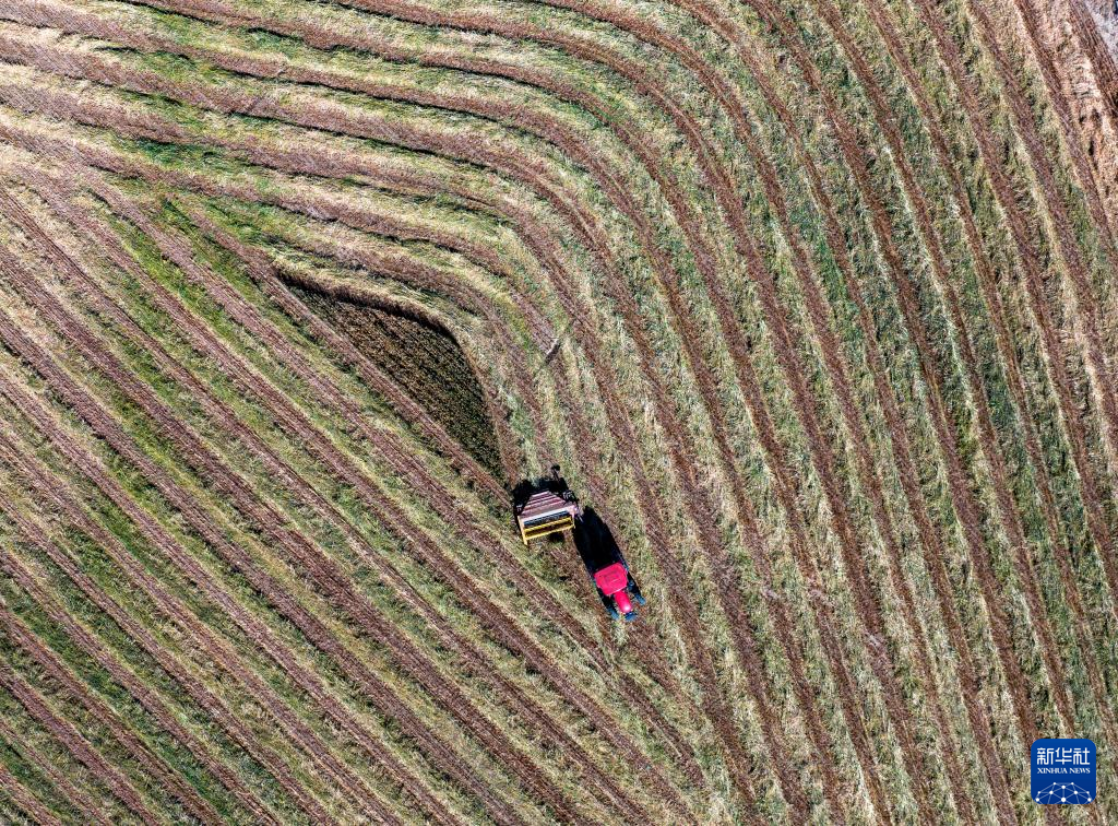 10月24日,村民駕駛農(nóng)機(jī)在拉薩市林周縣強(qiáng)嘎鄉(xiāng)曲嘎強(qiáng)村收割牧草(無(wú)人機(jī)照片)。新華社記者 姜帆 攝
