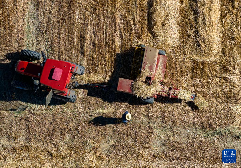 10月24日,村民駕駛農(nóng)機(jī)在拉薩市林周縣強(qiáng)嘎鄉(xiāng)曲嘎強(qiáng)村將收割過的牧草打包(無(wú)人機(jī)照片)。新華社記者 姜帆 攝