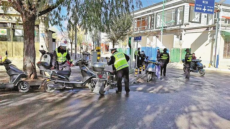 達(dá)孜區(qū)交警整頓非機(jī)動車亂停亂放等違法行為。拉薩記者站 攝