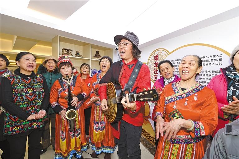“蟠龍社區(qū)生活著漢族、壯族、瑤族等15個民族的同胞,少數(shù)民族人口約占社區(qū)總人口的1/3?!斌待埳鐓^(qū)黨委副書記許玉君介紹說,社區(qū)結合多民族“嵌入式”居住的特點,創(chuàng)新踐行“136”工作機制,即圍繞鑄牢中華民族共同體意識這條主線,通過加強黨的領導、織牢精神紐帶、用好治理平臺“三個抓手”,積極創(chuàng)造各民族共居共學、共建共享、共事共樂的“六共”條件,讓各族群眾像石榴籽一樣緊緊抱在一起?!拔沂菨h族,會做壯族的特色菜,我愛人是仫佬族,漢字書法練得有模有樣。”蟠龍社區(qū)藝術團骨干何繼榮老人說。