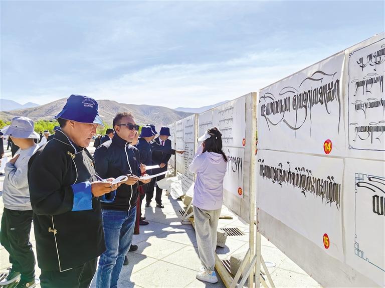 圖為在謝通門縣開展的書法、繪畫、攝影比賽中,評委在為作品打分。