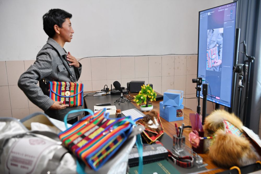 倉秋多吉通過網(wǎng)絡(luò)銷售當?shù)氐漠a(chǎn)品(8月24日攝)。
