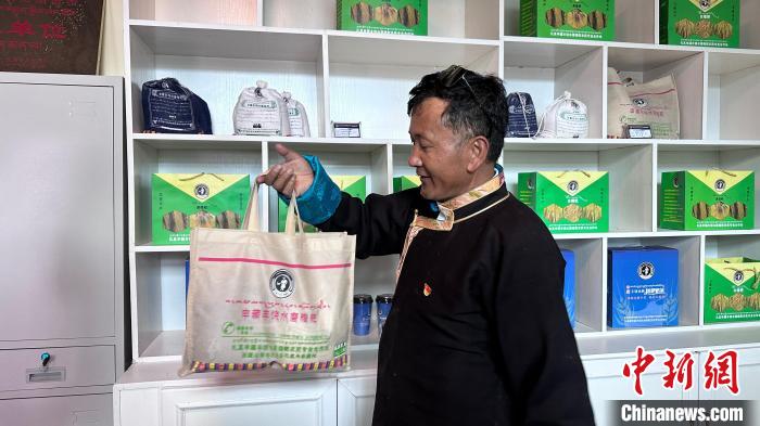 圖為申藏村黨支部書(shū)記旺扎正在向記者展示糌粑產(chǎn)品。澤塔雍措 攝