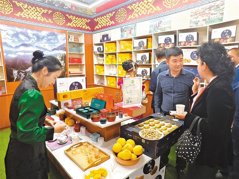 察隅縣供銷(xiāo)合作社工作人員在林芝城市會(huì)客廳內(nèi)展示農(nóng)特產(chǎn)品薏仁。