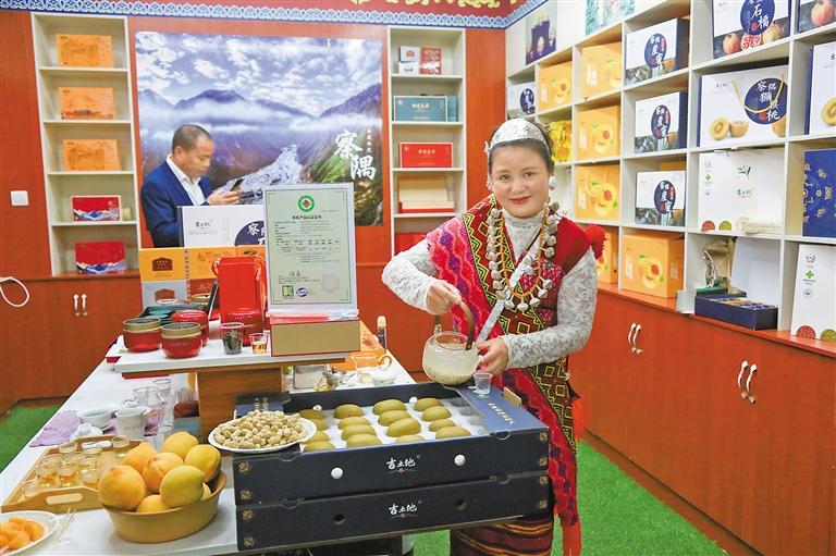 察隅縣供銷(xiāo)合作社工作人員向群眾推銷(xiāo)察隅花生和黃桃、獼猴桃等農(nóng)特產(chǎn)品。