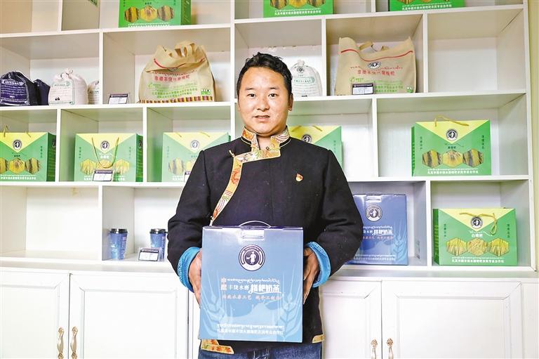 申藏村村民委員會(huì)副主任、鄉(xiāng)村振興專干久米旺久展示扎其申藏豐饒水磨糌粑合作社的產(chǎn)品。記者 頓珠扎西 攝