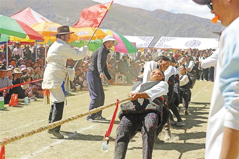 圖為農牧民參加三人兩足比賽。 本報記者 旦增嘎瓦 攝