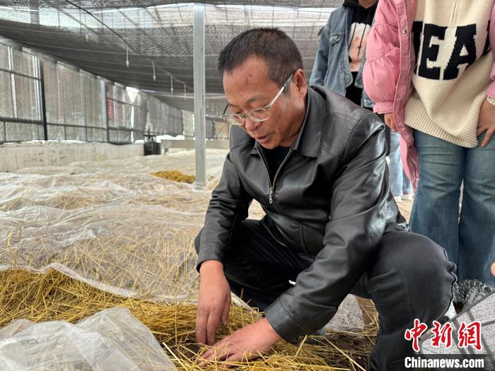 圖為王剛介紹高原有機赤松茸種植基地內(nèi)的情況。陳宗淇 攝