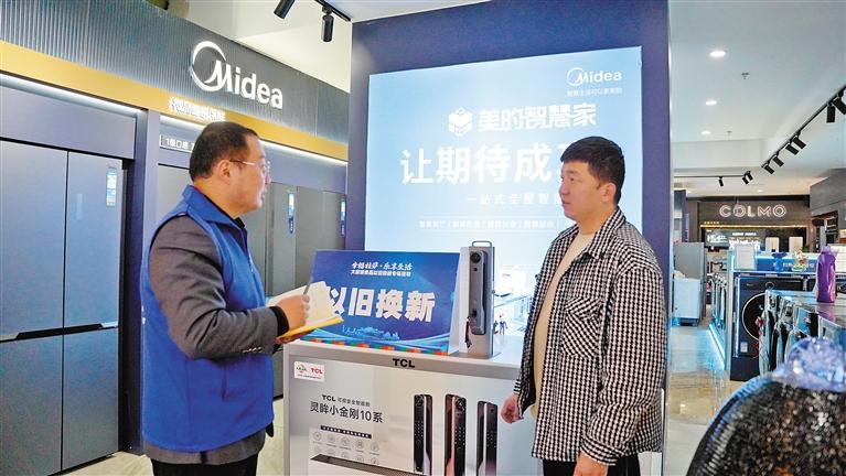 圖為在拉薩家具家電以舊換新專場,消費者向銷售人員了解相關政策。記者 貢曲羅杰 攝