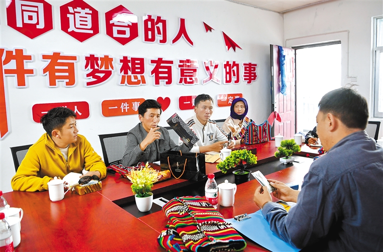 那曲市安多縣的大學(xué)畢業(yè)生倉秋多吉聯(lián)合6人創(chuàng)業(yè),于2021年創(chuàng)辦了安多托尕爾倉游牧產(chǎn)業(yè)有限責(zé)任公司。公司搭建了民族手工藝產(chǎn)品、土特產(chǎn)銷售平臺(tái),在當(dāng)?shù)卣畠?yōu)化營(yíng)商環(huán)境政策的支持下,創(chuàng)業(yè)團(tuán)隊(duì)逐步擴(kuò)大,帶動(dòng)了當(dāng)?shù)剞r(nóng)牧民產(chǎn)業(yè)興旺?!D為倉秋多吉(左二)和團(tuán)隊(duì)核心成員商討產(chǎn)品銷售提升策略。(資料圖片) 新華社記者 張汝鋒 攝