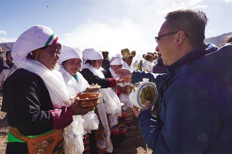 活動中,村民們身著節(jié)日盛裝,手捧象征五谷豐登的“切瑪”,唱起祈愿歌,互敬青稞酒,共同祈愿新的一年豐收。隨著鐵犁翻開土地,婦女們將手中的種子撒下,寄托著對豐收的殷切期望。政府領導、企業(yè)代表和村民們齊聚一堂,共同見證了這一充滿希望的農(nóng)事活動,同時也迎來了推動鄉(xiāng)村發(fā)展的重要時刻。