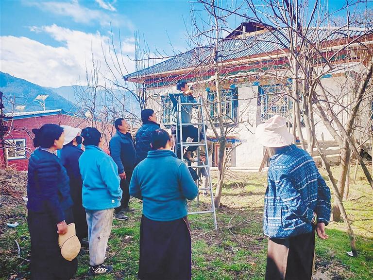 圖為永珠旦增為村民進(jìn)行交叉枝修剪示范。記者 劉楓 謝筱純 通訊員 錢于 攝