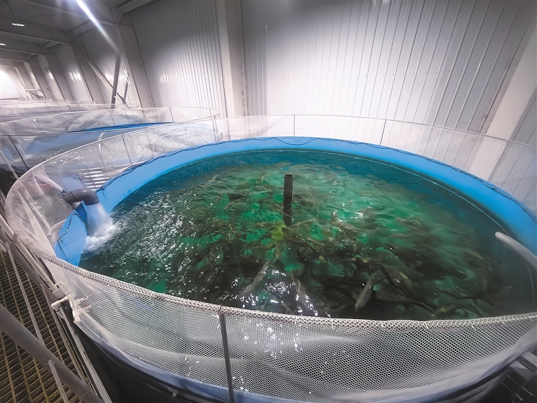 圖為在亞東鮭魚智能循環(huán)水養(yǎng)殖車間里,一尾尾亞東鮭魚在清澈的循環(huán)水里暢游。記者 扎西頓珠 攝