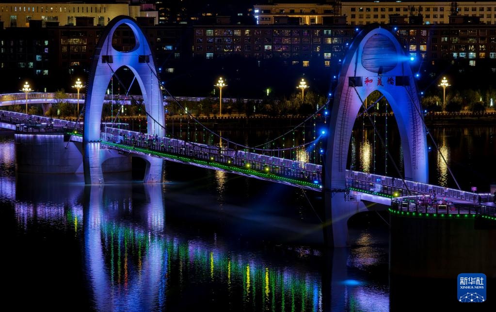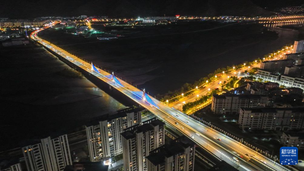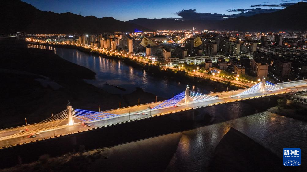 這是7月30日拍攝的拉薩河夜景,由近及遠(yuǎn)分別是和美橋、柳梧大橋和連心橋(無(wú)人機(jī)拼接照片)。新華社記者 姜帆 攝