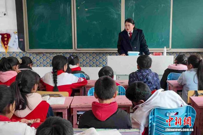圖為2025年4月,全國政協(xié)委員、西藏墨脫縣人民法院綜合審判庭庭長白瑪玉珍在墨脫縣格當(dāng)鄉(xiāng)小學(xué)為孩子們上法治課。(受訪者供圖)