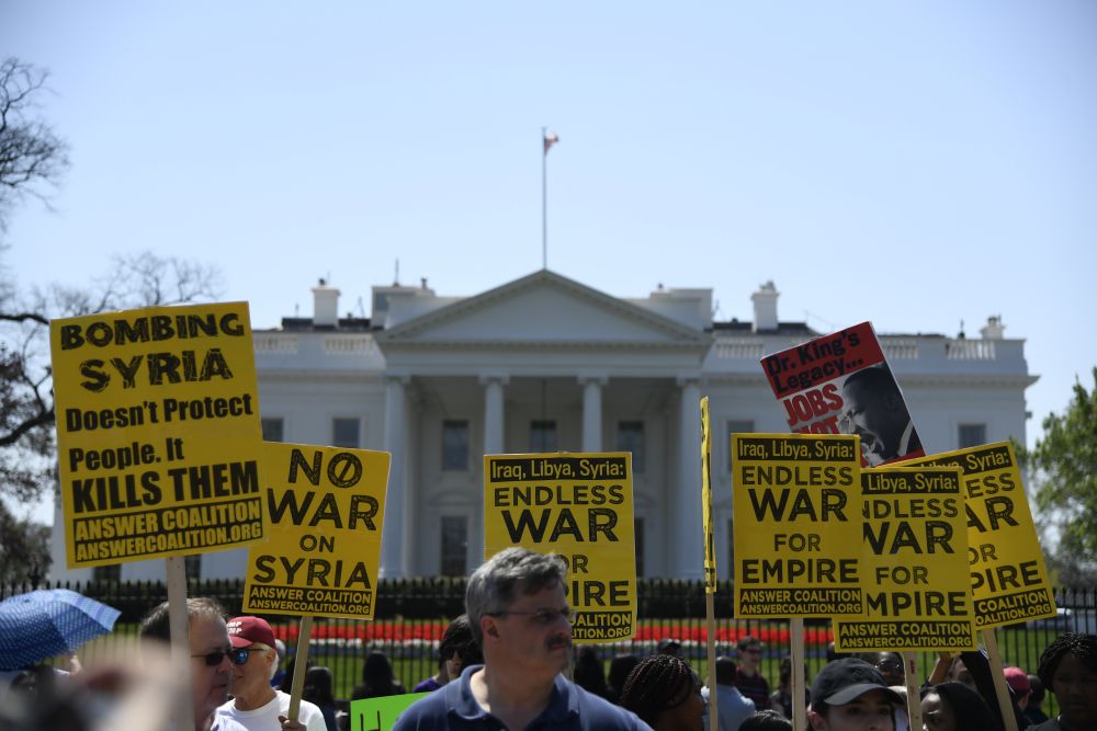 2018年4月14日,在美國華盛頓白宮北側(cè),人們手持標(biāo)語抗議對敘利亞進(jìn)行軍事打擊。新華社記者楊承霖?cái)z
