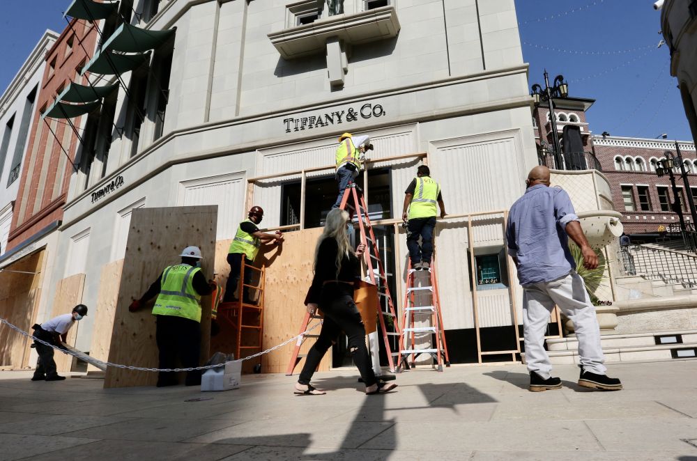 2020年11月2日,美國洛杉磯縣貝弗利山市商業(yè)區(qū)的商家將店鋪門窗封上。為應(yīng)對當(dāng)時(shí)美國大選可能出現(xiàn)的抗議或騷亂,貝弗利山市不少商業(yè)區(qū)加強(qiáng)防護(hù)和安保。 新華社發(fā)
